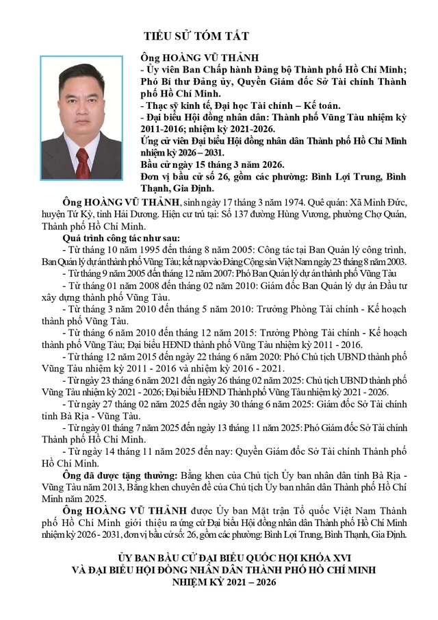Ông Hoàng Vũ Thảnh ứng cử Đại biểu Hội đồng nhân dân TP. Hồ Chí Minh Khóa XI tại Đơn vị bầu cử số 26, gồm các phường: Bình Lợi Trung, Bình Thạnh, Gia Định.