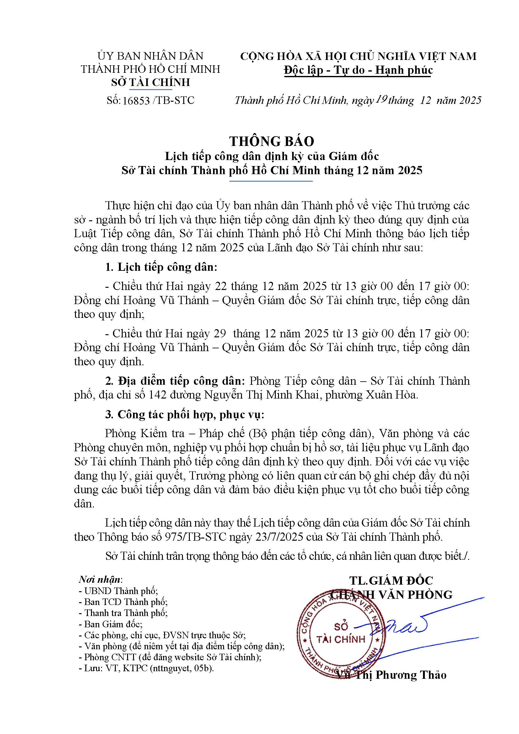 Lịch tiếp công dân định kỳ của Giám đốc Sở Tài chính tháng 12 năm 2025